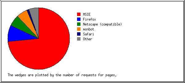 #pages: %pages: #reqs: %reqs: Gbytes: %bytes: browser ------: ------: ------: ------: ------: ------: ------- 22162: 8.06%: 104680: 11.31%: 0.69: 10.07%: Mozilla/4.0 (compatible; MSIE 6.0; Windows NT 5.1) 22537: 8.20%: 84933: 9.18%: 0.55: 7.96%: Mozilla/4.0 (compatible; MSIE 6.0; Windows NT 5.1; SV1; .NET CLR 1.1.4322) 21011: 7.64%: 82245: 8.89%: 0.52: 7.60%: Mozilla/4.0 (compatible; MSIE 6.0; Windows NT 5.1; SV1) 34655: 12.60%: 67196: 7.26%: 0.47: 6.79%: Mozilla/4.0 (compatible; MSIE 5.13; Mac_PowerPC) 13422: 4.88%: 58714: 6.35%: 0.43: 6.25%: Mozilla/4.0 (compatible; MSIE 6.0; Windows NT 5.0) 6732: 2.45%: 32499: 3.51%: 0.20: 2.96%: Mozilla/4.0 (compatible; MSIE 6.0; Windows NT 5.1; .NET CLR 1.1.4322) 5317: 1.93%: 24118: 2.61%: 0.15: 2.13%: Mozilla/4.0 (compatible; MSIE 6.0; Windows 98) 4890: 1.78%: 17119: 1.85%: 0.07: 1.09%: Mozilla/4.0 (compatible; MSIE 6.0; Windows NT 5.1; SV1; .NET CLR 1.0.3705) 5446: 1.98%: 15275: 1.65%: 0.06: 0.85%: Mozilla/4.0 (compatible; MSIE 6.0; Windows 98; Win 9x 4.90) 11324: 4.12%: 11844: 1.28%: 0.27: 3.88%: msnbot/1.0 ( http://search.msn.com/msnbot.htm) 3346: 1.22%: 11656: 1.26%: 0.06: 0.86%: Mozilla/4.0 (compatible; MSIE 5.5; Windows 98; Win 9x 4.90) 5822: 2.12%: 11377: 1.23%: 0.03: 0.50%: Mozilla/4.0 (compatible; MSIE 5.23; Mac_PowerPC) 2027: 0.74%: 10852: 1.17%: 0.06: 0.90%: Mozilla/4.0 (compatible; MSIE 6.0; Windows NT 5.1; .NET CLR 1.0.3705) 2817: 1.02%: 9684: 1.05%: 0.07: 1.08%: Mozilla/5.0 (Windows; U; Windows NT 5.1; fi-FI; rv:1.7.12) Gecko/20050919 Firefox/1.0.7 2110: 0.77%: 9620: 1.04%: 0.08: 1.14%: Mozilla/4.0 (compatible; MSIE 6.0; Windows NT 5.0; .NET CLR 1.1.4322) 2023: 0.74%: 8280: 0.89%: 0.05: 0.79%: Mozilla/4.0 (compatible; MSIE 6.0; Windows NT 4.0) 1817: 0.66%: 8100: 0.88%: 0.05: 0.72%: Mozilla/4.0 (compatible; MSIE 5.01; Windows NT 5.0) 347: 0.13%: 7341: 0.79%: 0.00: 0.06%: Mozilla/5.0 (Macintosh; U; PPC Mac OS X; et-ee) AppleWebKit/125.5.5 (KHTML, like Gecko) Safari/125.11 6675: 2.43%: 6971: 0.75%: 0.10: 1.42%: Mozilla/5.0 (compatible; Googlebot/2.1; http://www.google.com/bot.html) 2145: 0.78%: 6720: 0.73%: 0.05: 0.74%: Mozilla/4.0 (compatible; MSIE 6.0; Windows NT 5.1; SV1; SON-1102CD) 6064: 2.21%: 6672: 0.72%: 0.21: 3.07%: Mozilla/5.0 (compatible; Yahoo! Slurp; http://help.yahoo.com/help/us/ysearch/slurp) 1682: 0.61%: 6570: 0.71%: 0.05: 0.80%: Mozilla/5.0 (Windows; U; Windows NT 5.1; fi-FI; rv:1.7.5) Gecko/20041108 Firefox/1.0 1613: 0.59%: 6490: 0.70%: 0.03: 0.49%: Mozilla/4.0 (compatible; MSIE 5.0; Windows 98; DigExt) 2390: 0.87%: 6051: 0.65%: 0.16: 2.38%: Mozilla/5.0 (Macintosh; U; PPC Mac OS X Mach-O; en-US; rv:1.7.8) Gecko/20050511 Firefox/1.0.4 1444: 0.53%: 5872: 0.63%: 0.04: 0.56%: Mozilla/4.0 (compatible; MSIE 6.0; Windows NT 5.1; FunWebProducts) 1317: 0.48%: 4924: 0.53%: 0.04: 0.55%: Mozilla/4.0 (compatible; MSIE 6.0; Windows NT 5.1; SV1; SON-1102CD; .NET CLR 1.1.4322) 1189: 0.43%: 4772: 0.52%: 0.04: 0.54%: Mozilla/5.0 (Windows; U; Windows NT 5.1; fi; rv:1.8.0.4) Gecko/20060508 Firefox/1.5.0.4 1038: 0.38%: 4649: 0.50%: 0.04: 0.61%: Mozilla/4.0 (compatible; MSIE 5.5; Windows NT 5.0) 945: 0.34%: 4521: 0.49%: 0.03: 0.39%: Mozilla/4.0 (compatible; MSIE 6.0; Windows NT 5.1; son0302CD; SV1) 1249: 0.45%: 4307: 0.47%: 0.04: 0.55%: Mozilla/5.0 (Windows; U; Windows NT 5.1; fi-FI; rv:1.7.8) Gecko/20050511 Firefox/1.0.4 1114: 0.41%: 4190: 0.45%: 0.04: 0.55%: Mozilla/5.0 (Windows; U; Windows NT 5.1; fi; rv:1.8.0.3) Gecko/20060426 Firefox/1.5.0.3 1105: 0.40%: 4156: 0.45%: 0.03: 0.37%: Mozilla/4.0 (compatible; MSIE 6.0; Windows 98; .NET CLR 1.1.4322) 1340: 0.49%: 4041: 0.44%: 0.01: 0.12%: Mozilla/4.0 (compatible; MSIE 6.0; Windows NT 5.1; son-OEM-1101; .NET CLR 1.0.3705; .NET CLR 1.1.4322) 700: 0.25%: 3851: 0.42%: 0.03: 0.45%: Mozilla/4.0 (compatible; MSIE 6.0; Windows NT 5.1; SON-1102CD; SV1; .NET CLR 1.1.4322) 767: 0.28%: 3662: 0.40%: 0.02: 0.29%: Mozilla/4.0 (compatible; MSIE 5.5; Windows 98) 740: 0.27%: 3477: 0.38%: 0.02: 0.29%: Mozilla/4.0 (compatible; MSIE 5.01; Windows 98) 911: 0.33%: 3442: 0.37%: 0.02: 0.35%: Mozilla/4.0 (compatible; MSIE 6.0; Windows NT 5.1; SV1; .NET CLR 1.0.3705; .NET CLR 1.1.4322) 1067: 0.39%: 3441: 0.37%: 0.02: 0.33%: Mozilla/4.0 (compatible; MSIE 6.0; Windows NT 5.1; SV1; .NET CLR 1.1.4322; .NET CLR 2.0.50727) 852: 0.31%: 3439: 0.37%: 0.03: 0.46%: Mozilla/5.0 (Windows; U; Windows NT 5.1; fi; rv:1.8.0.1) Gecko/20060111 Firefox/1.5.0.1 971: 0.35%: 3353: 0.36%: 0.03: 0.40%: Mozilla/5.0 (Windows; U; Windows NT 5.1; fi-FI; rv:1.7.10) Gecko/20050717 Firefox/1.0.6 69877: 25.41%: 244154: 26.39%: 1.96: 28.65%: [not listed: 1,533 browsers]