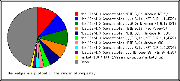 #pages: %pages: #reqs: %reqs: Gbytes: %bytes: browser ------: ------: ------: ------: ------: ------: ------- 22162: 8.06%: 104680: 11.31%: 0.69: 10.07%: Mozilla/4.0 (compatible; MSIE 6.0; Windows NT 5.1) 22537: 8.20%: 84933: 9.18%: 0.55: 7.96%: Mozilla/4.0 (compatible; MSIE 6.0; Windows NT 5.1; SV1; .NET CLR 1.1.4322) 21011: 7.64%: 82245: 8.89%: 0.52: 7.60%: Mozilla/4.0 (compatible; MSIE 6.0; Windows NT 5.1; SV1) 34655: 12.60%: 67196: 7.26%: 0.47: 6.79%: Mozilla/4.0 (compatible; MSIE 5.13; Mac_PowerPC) 13422: 4.88%: 58714: 6.35%: 0.43: 6.25%: Mozilla/4.0 (compatible; MSIE 6.0; Windows NT 5.0) 6732: 2.45%: 32499: 3.51%: 0.20: 2.96%: Mozilla/4.0 (compatible; MSIE 6.0; Windows NT 5.1; .NET CLR 1.1.4322) 5317: 1.93%: 24118: 2.61%: 0.15: 2.13%: Mozilla/4.0 (compatible; MSIE 6.0; Windows 98) 4890: 1.78%: 17119: 1.85%: 0.07: 1.09%: Mozilla/4.0 (compatible; MSIE 6.0; Windows NT 5.1; SV1; .NET CLR 1.0.3705) 5446: 1.98%: 15275: 1.65%: 0.06: 0.85%: Mozilla/4.0 (compatible; MSIE 6.0; Windows 98; Win 9x 4.90) 11324: 4.12%: 11844: 1.28%: 0.27: 3.88%: msnbot/1.0 ( http://search.msn.com/msnbot.htm) 3346: 1.22%: 11656: 1.26%: 0.06: 0.86%: Mozilla/4.0 (compatible; MSIE 5.5; Windows 98; Win 9x 4.90) 5822: 2.12%: 11377: 1.23%: 0.03: 0.50%: Mozilla/4.0 (compatible; MSIE 5.23; Mac_PowerPC) 2027: 0.74%: 10852: 1.17%: 0.06: 0.90%: Mozilla/4.0 (compatible; MSIE 6.0; Windows NT 5.1; .NET CLR 1.0.3705) 2817: 1.02%: 9684: 1.05%: 0.07: 1.08%: Mozilla/5.0 (Windows; U; Windows NT 5.1; fi-FI; rv:1.7.12) Gecko/20050919 Firefox/1.0.7 2110: 0.77%: 9620: 1.04%: 0.08: 1.14%: Mozilla/4.0 (compatible; MSIE 6.0; Windows NT 5.0; .NET CLR 1.1.4322) 2023: 0.74%: 8280: 0.89%: 0.05: 0.79%: Mozilla/4.0 (compatible; MSIE 6.0; Windows NT 4.0) 1817: 0.66%: 8100: 0.88%: 0.05: 0.72%: Mozilla/4.0 (compatible; MSIE 5.01; Windows NT 5.0) 347: 0.13%: 7341: 0.79%: 0.00: 0.06%: Mozilla/5.0 (Macintosh; U; PPC Mac OS X; et-ee) AppleWebKit/125.5.5 (KHTML, like Gecko) Safari/125.11 6675: 2.43%: 6971: 0.75%: 0.10: 1.42%: Mozilla/5.0 (compatible; Googlebot/2.1; http://www.google.com/bot.html) 2145: 0.78%: 6720: 0.73%: 0.05: 0.74%: Mozilla/4.0 (compatible; MSIE 6.0; Windows NT 5.1; SV1; SON-1102CD) 6064: 2.21%: 6672: 0.72%: 0.21: 3.07%: Mozilla/5.0 (compatible; Yahoo! Slurp; http://help.yahoo.com/help/us/ysearch/slurp) 1682: 0.61%: 6570: 0.71%: 0.05: 0.80%: Mozilla/5.0 (Windows; U; Windows NT 5.1; fi-FI; rv:1.7.5) Gecko/20041108 Firefox/1.0 1613: 0.59%: 6490: 0.70%: 0.03: 0.49%: Mozilla/4.0 (compatible; MSIE 5.0; Windows 98; DigExt) 2390: 0.87%: 6051: 0.65%: 0.16: 2.38%: Mozilla/5.0 (Macintosh; U; PPC Mac OS X Mach-O; en-US; rv:1.7.8) Gecko/20050511 Firefox/1.0.4 1444: 0.53%: 5872: 0.63%: 0.04: 0.56%: Mozilla/4.0 (compatible; MSIE 6.0; Windows NT 5.1; FunWebProducts) 1317: 0.48%: 4924: 0.53%: 0.04: 0.55%: Mozilla/4.0 (compatible; MSIE 6.0; Windows NT 5.1; SV1; SON-1102CD; .NET CLR 1.1.4322) 1189: 0.43%: 4772: 0.52%: 0.04: 0.54%: Mozilla/5.0 (Windows; U; Windows NT 5.1; fi; rv:1.8.0.4) Gecko/20060508 Firefox/1.5.0.4 1038: 0.38%: 4649: 0.50%: 0.04: 0.61%: Mozilla/4.0 (compatible; MSIE 5.5; Windows NT 5.0) 945: 0.34%: 4521: 0.49%: 0.03: 0.39%: Mozilla/4.0 (compatible; MSIE 6.0; Windows NT 5.1; son0302CD; SV1) 1249: 0.45%: 4307: 0.47%: 0.04: 0.55%: Mozilla/5.0 (Windows; U; Windows NT 5.1; fi-FI; rv:1.7.8) Gecko/20050511 Firefox/1.0.4 1114: 0.41%: 4190: 0.45%: 0.04: 0.55%: Mozilla/5.0 (Windows; U; Windows NT 5.1; fi; rv:1.8.0.3) Gecko/20060426 Firefox/1.5.0.3 1105: 0.40%: 4156: 0.45%: 0.03: 0.37%: Mozilla/4.0 (compatible; MSIE 6.0; Windows 98; .NET CLR 1.1.4322) 1340: 0.49%: 4041: 0.44%: 0.01: 0.12%: Mozilla/4.0 (compatible; MSIE 6.0; Windows NT 5.1; son-OEM-1101; .NET CLR 1.0.3705; .NET CLR 1.1.4322) 700: 0.25%: 3851: 0.42%: 0.03: 0.45%: Mozilla/4.0 (compatible; MSIE 6.0; Windows NT 5.1; SON-1102CD; SV1; .NET CLR 1.1.4322) 767: 0.28%: 3662: 0.40%: 0.02: 0.29%: Mozilla/4.0 (compatible; MSIE 5.5; Windows 98) 740: 0.27%: 3477: 0.38%: 0.02: 0.29%: Mozilla/4.0 (compatible; MSIE 5.01; Windows 98) 911: 0.33%: 3442: 0.37%: 0.02: 0.35%: Mozilla/4.0 (compatible; MSIE 6.0; Windows NT 5.1; SV1; .NET CLR 1.0.3705; .NET CLR 1.1.4322) 1067: 0.39%: 3441: 0.37%: 0.02: 0.33%: Mozilla/4.0 (compatible; MSIE 6.0; Windows NT 5.1; SV1; .NET CLR 1.1.4322; .NET CLR 2.0.50727) 852: 0.31%: 3439: 0.37%: 0.03: 0.46%: Mozilla/5.0 (Windows; U; Windows NT 5.1; fi; rv:1.8.0.1) Gecko/20060111 Firefox/1.5.0.1 971: 0.35%: 3353: 0.36%: 0.03: 0.40%: Mozilla/5.0 (Windows; U; Windows NT 5.1; fi-FI; rv:1.7.10) Gecko/20050717 Firefox/1.0.6 69877: 25.41%: 244154: 26.39%: 1.96: 28.65%: [not listed: 1,533 browsers]